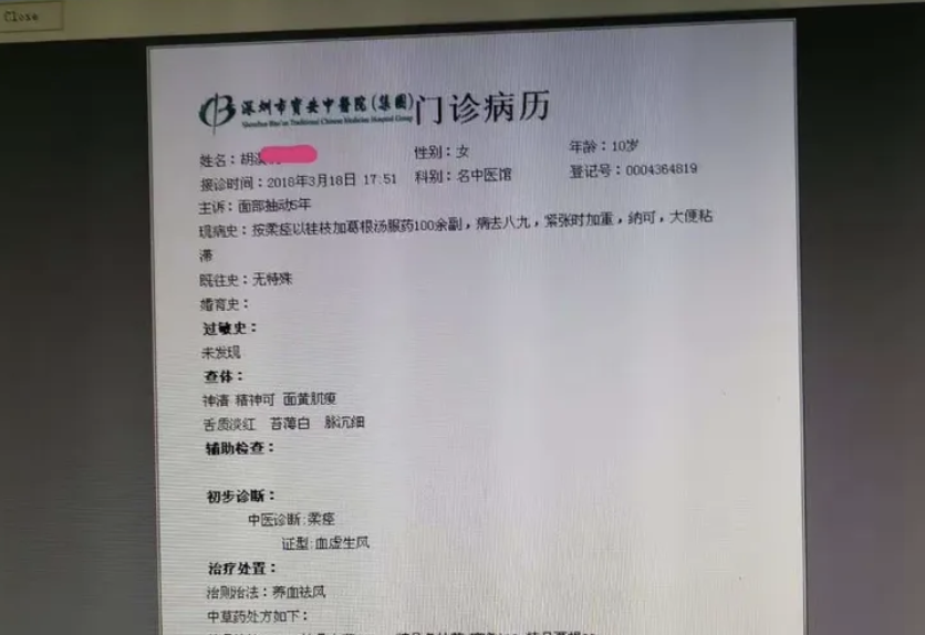 2018年3月18日上午跟師父王三虎教授深圳市名中醫館門診, 眼見一位媽媽帶著一位面黃肌瘦小女孩坐著候診,我心想這麼小的女孩患上癌症嗎 ?上前與女孩媽媽詢問,才知女孩不是患癌症,是面部肌肉抽動,到處求診療效不理想, 前來求診,有 幸得到教授為她治療數個月,面部肌肉抽動基本消失。診斷:柔痙(血虛生風), 拟四物湯合葛根湯加減 。口服百余劑中藥後面部肌肉抽動基本消失, 說明腫瘤專家治療疑難雜症,同樣很了得。