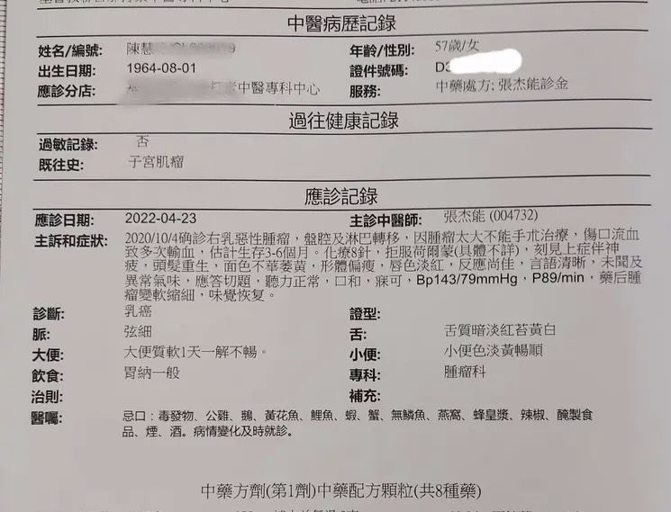 陳女士,58歲,2017年發現右乳房近乳頭有一粒豆大的腫物,患者未重視。繼後乳頭出現疼痛滲液,傷口多次大出血而入院輸血。2020年10月4日确診乳腺癌,醫院醫生說:因腫瘤面積太大同時入侵肋骨,盤腔及淋巴轉移,不能手術治療,估計生存3至6個月左右。醫護朋友了解病情後,叫他放棄痛苦的放化治療,開心過日子,會活得長一點,而拒化療。