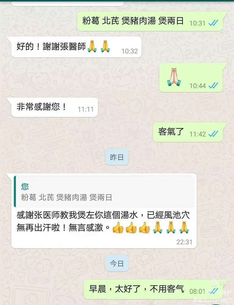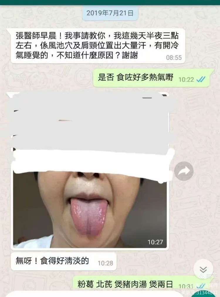主诉近期夜睡後颈枕部大量汗出,嘱她用食療 粉葛、黄芪、猪肉煲汤佐膳,数日后回饋, 效果見下文。