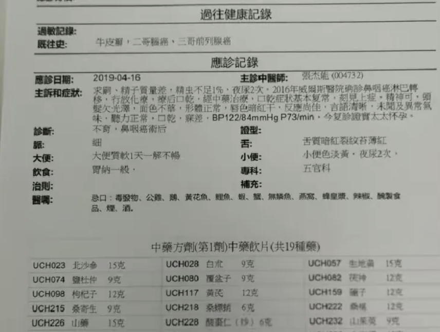 一位五十歲出頭男性,鼻咽癌患者經我治療,放療副作用完全消除,某次覆診向我諮詢,問精子弱、精蟲不到1%能否用中藥治療令他生育, 回答成功個案不少。不久他帶同夫人一起來找我,用中藥調理。今天夫婦二人覆診向我報喜,連續兩次妊娠測試均為陽性,開心非常!